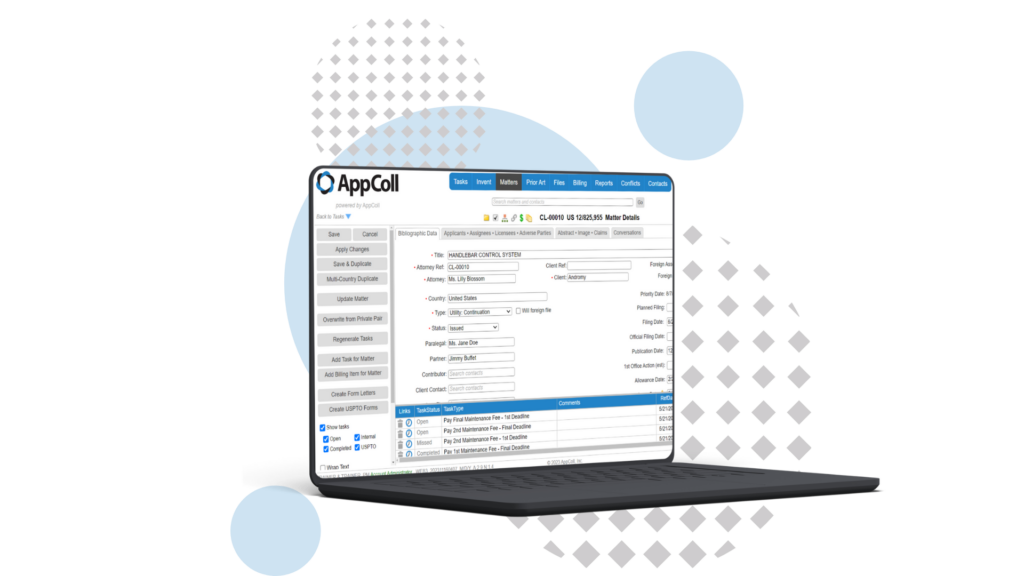 Developed with insights from patent attorneys, agents, paralegals, and docketing specialists, AppColl® provides a cost-effective and user-friendly patent & trademark docketing system. This system enhances productivity and organization through extensive automation.